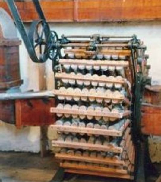 In the beginning of flour milling, two stones were used to crush grain. In the latter part of the 1800s the technology of cold steel made it possible to develop rolls that would accomplish the task in a much more efficient manner. This roll stand contains two sets of rolls, and the mill has a total of four roll stands.