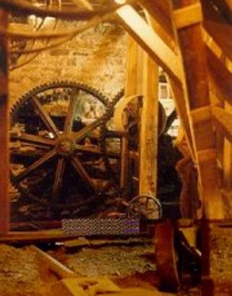 The main gear inside the mill is attached to the water wheel and provides power for numerous pulleys and belts that drove the mill's machinery. This gear is taller than the average person and is made of cast iron. When the mill was built at the end of the 19th century the machines, gears and other equipment was brought into Las Vegas, New Mexico by train, then transported by wagon to the mill site in the Mora Valley. Today, a trip between these places is only about thirty minutes, back then the journey by wagon took all day.